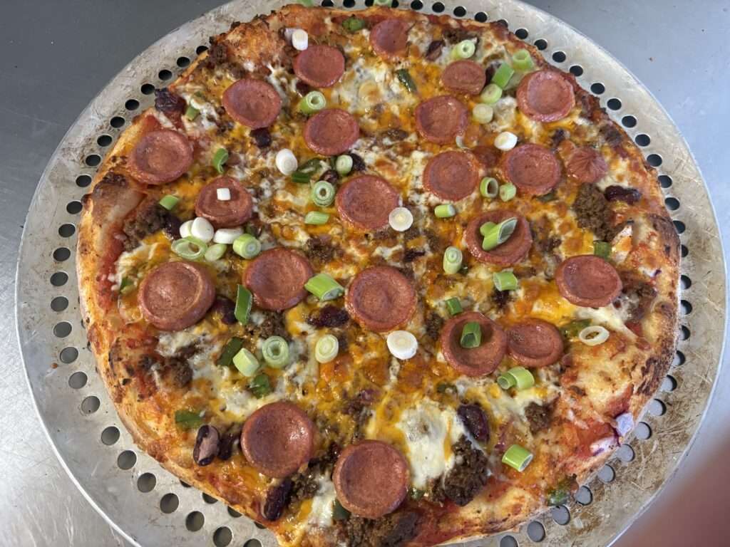 All the flavour of a ballpark classic, baked on a crispy pizza crust! This pie is loaded with seasoned ground beef, zesty chili beans, melty cheddar and mozzarella, jalapeños and topped with pepperoni “dog” slices and fresh green onions. A bold, cheesy twist that brings chili night and pizza night together in every bite.